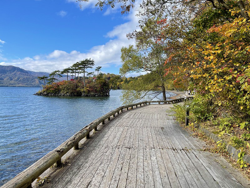 「廻堰大溜池(津軽富士見湖)」に架かる長さ300mの木橋「鶴の舞橋」。改修工事中のため渡ることはできなかった。(2025.9)