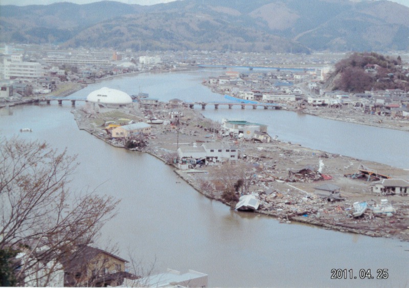 震災から1ヶ月半後の「日和山公園」から見下ろす旧北上川の中州。両岸の多くの建物が津波で流された。(2011.4)