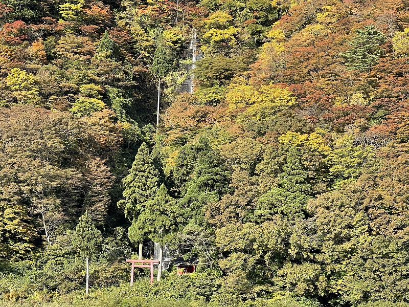最上峡に落ちる高さ123mの「白糸の滝」。わずかに顔を覗かせる。(2021.10)