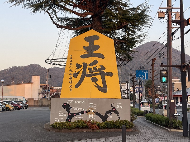 温泉街にも建つ将棋駒のモニュメント。(2023.11)