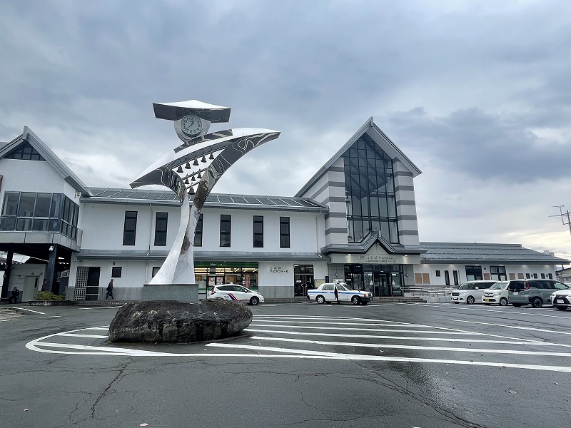 山形新幹線、奥羽本線、山形鉄道フラワー長井線の3路線が乗り入れる市の中心駅「赤湯駅」。(2023.11)