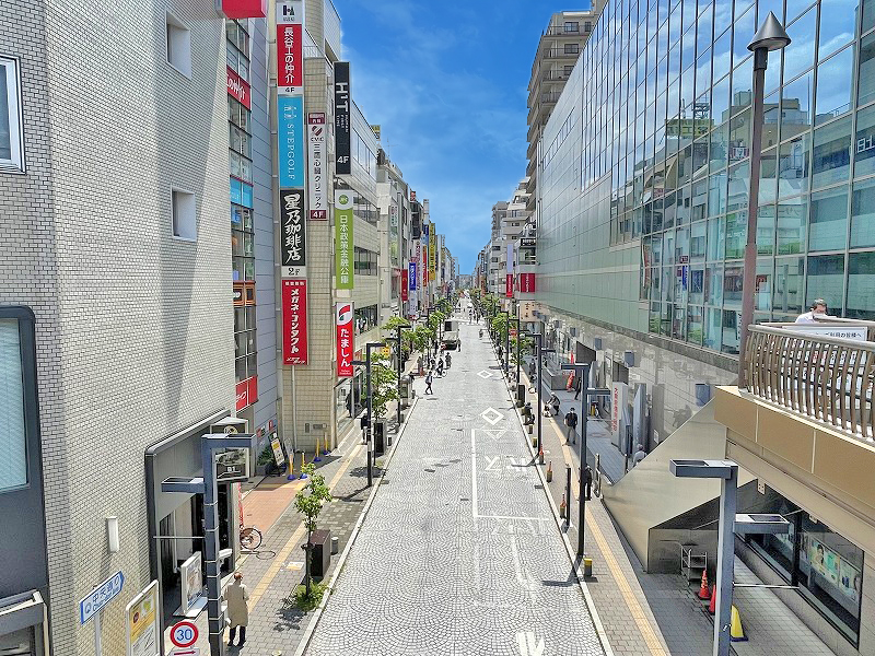 聖蹟桜ヶ丘駅南口から続く「いろは坂通り」。「耳をすませば」で描かれた坂道のモデルとなった。(2019.6)