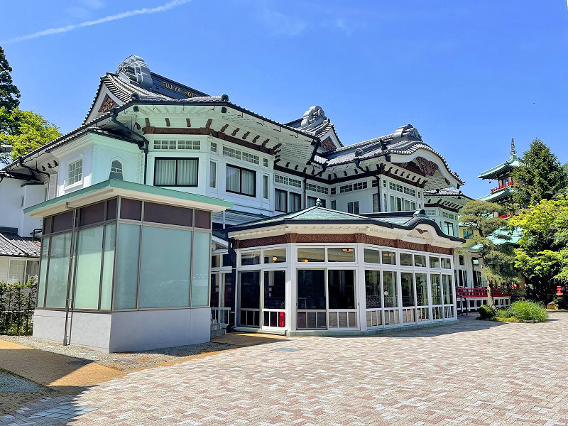 1878年に日本初の本格的なリゾートホテルとして宮ノ下に開業した「富士屋ホテル」。1891年築の大きな唐破風屋根が特徴の「本館」。(2024.5)