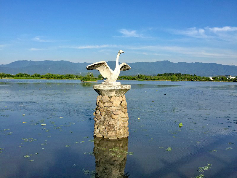 鳥屋野潟越しに望むアルビレックス新潟のホームスタジアム「新潟スタジアム(デンカビッグスワンスタジアム)」。(2021.9)