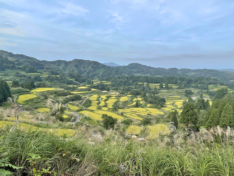 コシヒカリの田園越しに望む「越後駒ヶ岳」(写真中央)と「八海山」(写真右)。(2021.9)