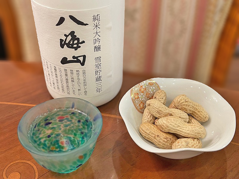 新潟を代表する銘酒「八海山」。食糧貯蔵庫「雪室」で熟成し、3年間寝かせた「雪室貯蔵三年」。しっとりとした味わい。(2021.9)