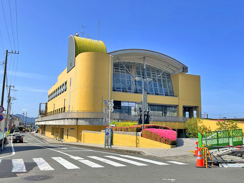 2020年に隈研吾設計により新駅舎が完成した御殿場線「足柄駅」。金太郎生誕の地としてPRするために建てられた「金太郎像」。(2025.5)