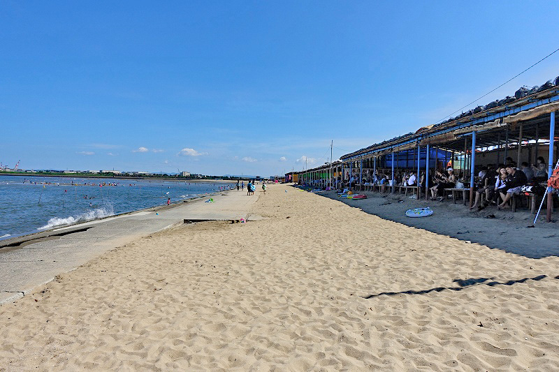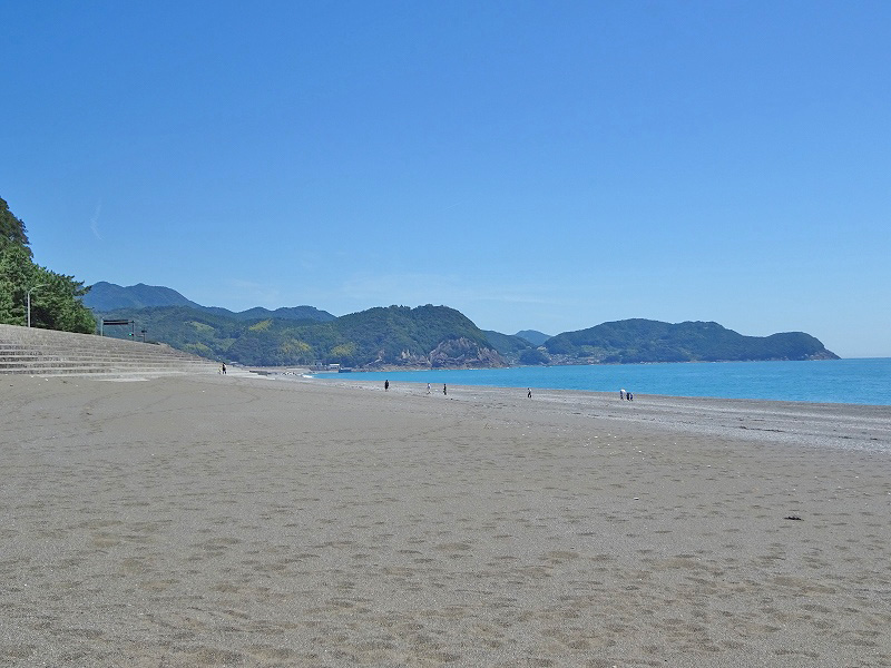 大潮時には150m沖まで水が引き浮島が出没する遠浅の海。あさり、バカ貝、マテ貝などの潮干狩りが盛ん。(2019.8)