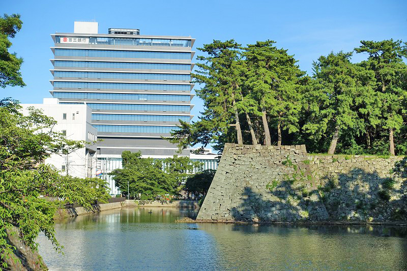 藤堂家が治めた「津城址」の堀。城内は現在は「お城公園」として使用。背後に聳える「百五銀行丸之内本部棟」。(2019.8)