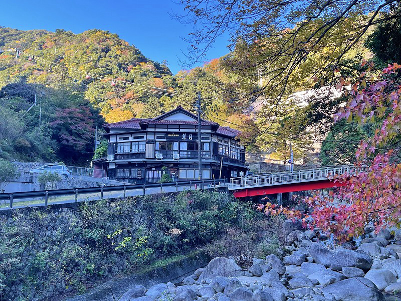 「三滝川」河畔に沿って温泉宿が並ぶ「湯の山温泉」。(2024.11)