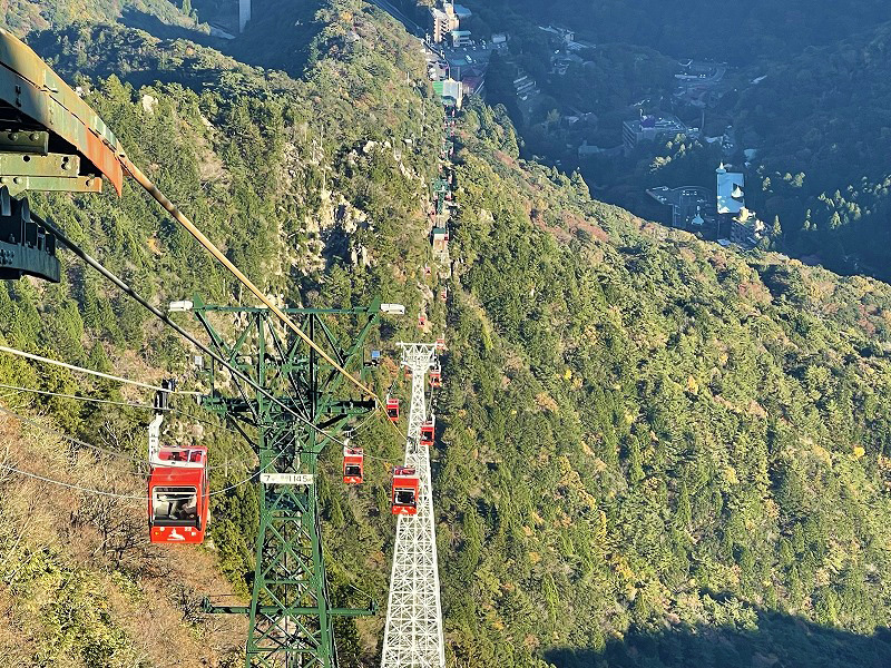 湯の山温泉と御在所岳山頂を結ぶ「御在所ロープウエイ」(1959年開業)。(2024.11)