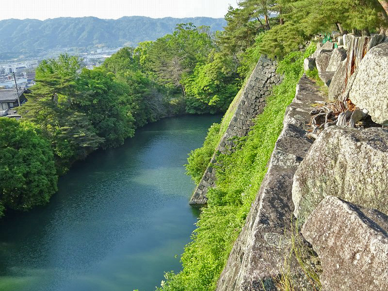 高さ30mにも及ぶ石垣。丘の上に立つ平山城なので市内中心部の至る所から見上げることができる。(2017.5)