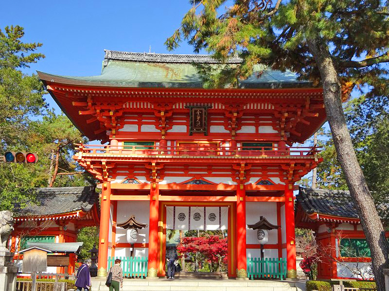 四条通の東の終端に鎮座する「八坂神社」の「西楼門」(1497年建立)。(2017.4)