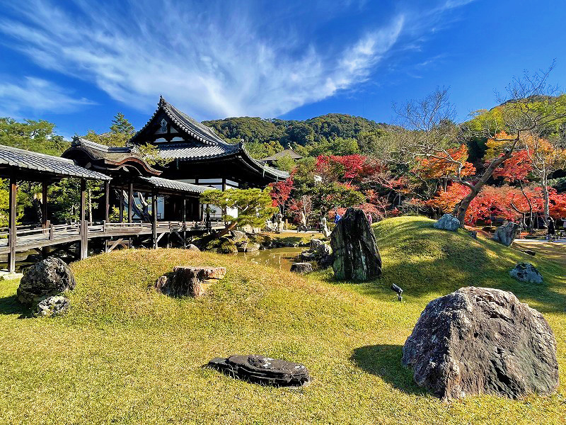 もみじが赤く映る「放生池(ほうじょうち)」を中心に東山を借景にした池泉回遊式庭園。(2021.11)