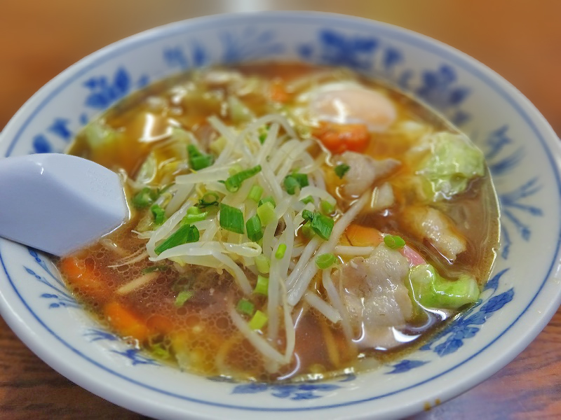 商店街の片隅に軒を構える「まつき食堂」の「ちゃんぽん」。やや甘みの入った素朴なスープ。懐かしい味。(2018.11)