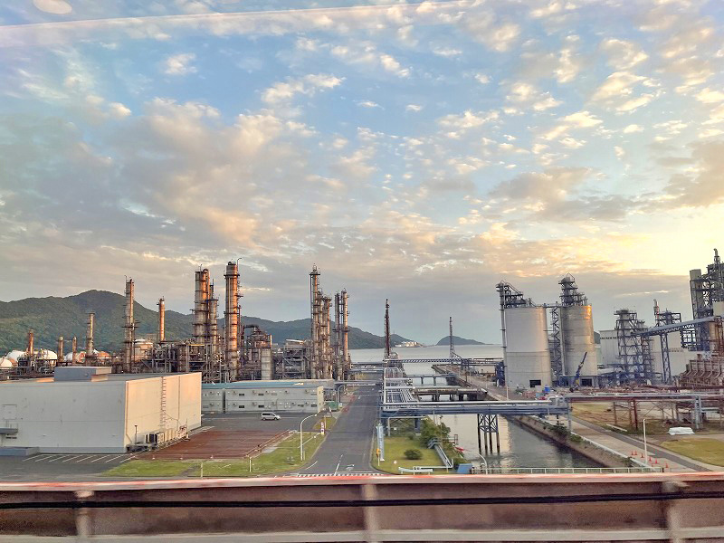新幹線の車窓から望む「出光興産徳山事業所」。1957年に出光初の製油所として操業を開始した石油化学コンビナート。(2022.5)