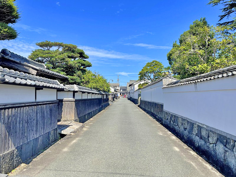 200mにわたって白壁と格子窓の商家が軒を連ねる「古市・金屋白壁の街並み」。(2023.10)