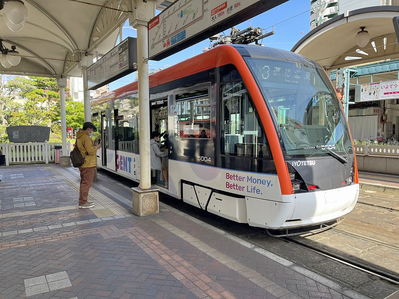 松山市駅と道後温泉とを結ぶ路面電車「伊予鉄道松山市内線」。(2022.4)