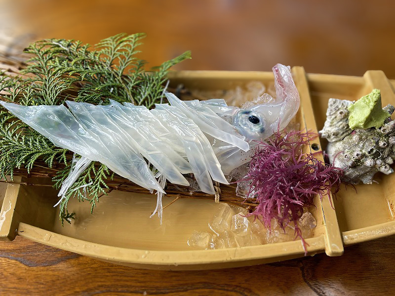 「海鮮門 いか太郎」の「いか活き造り」。歯ごたえは鮮度の証明。動いてはなく安堵。(2022.5)