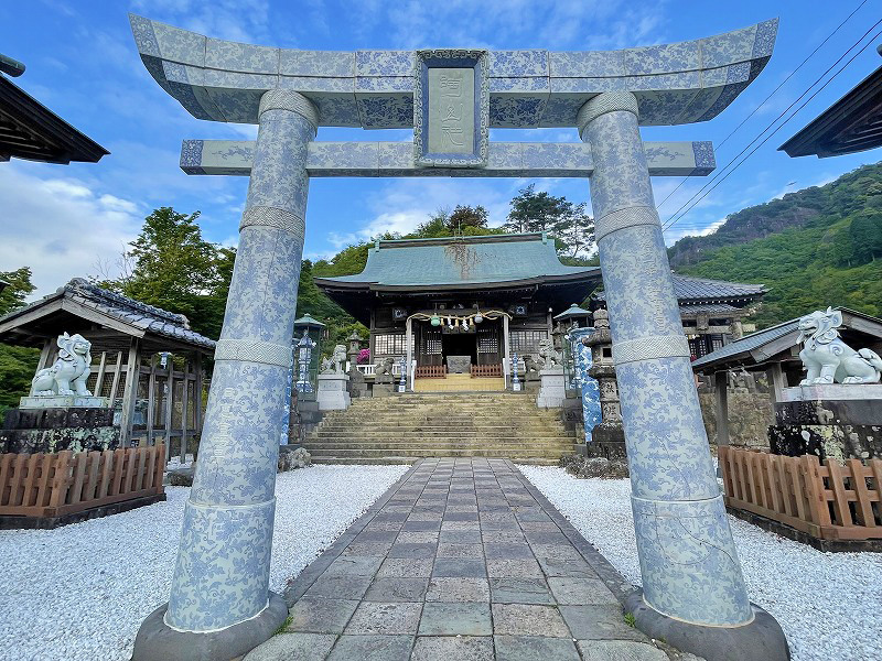 白磁製の鳥居に磁器製の狛犬。名工の技が境内の随所で見られる有田焼の野外美術館。(2022.5)