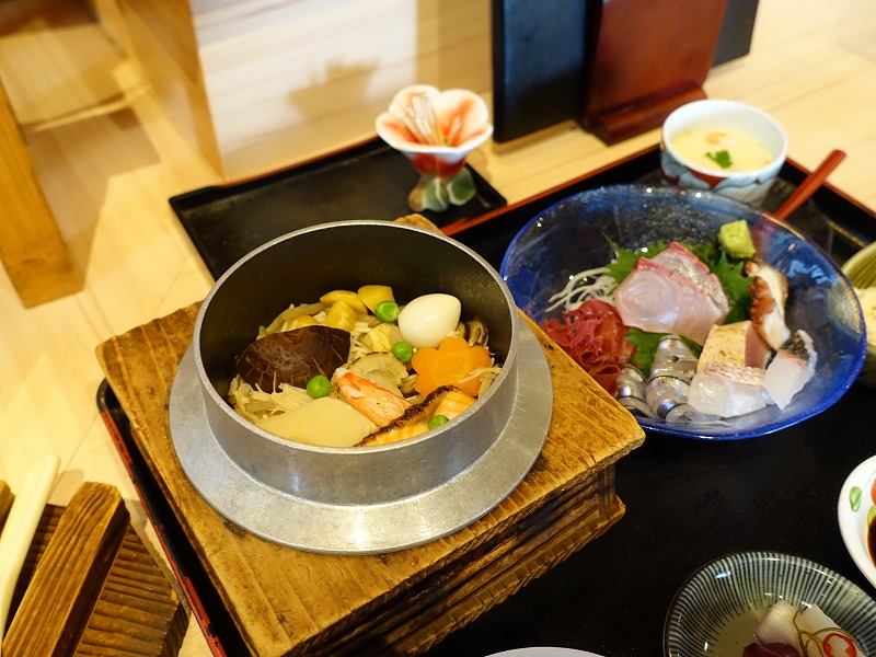 五島近海で獲れた魚介を用いた「いけす割烹 心誠」の「刺身釜飯定食」。(2023.3)