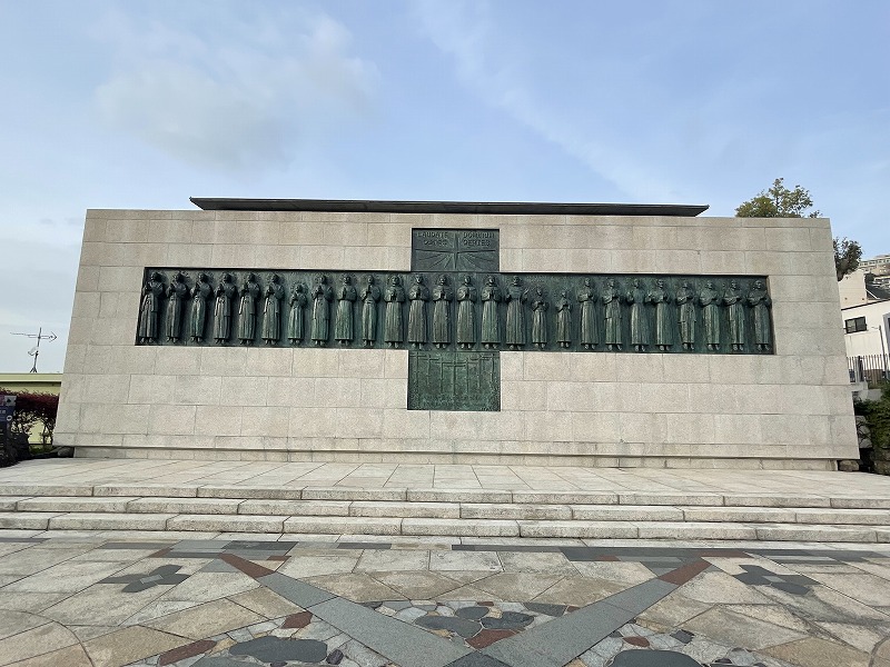 1597年にキリシタン禁止令により処刑された26人の宣教師、信徒を追悼する「日本二十六聖人殉教地祈念碑」。(2023.3)
