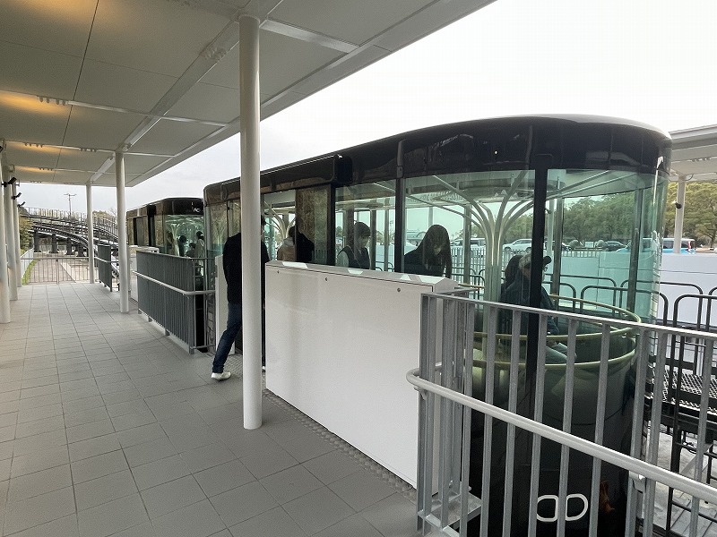 稲佐山中腹の駐車場から「稲佐山山頂展望台」に登る「長崎稲佐山スロープカー」。フェラーリなどを手掛けた工業デザイナー奥山清行氏が率いる「KENOKUYAMADESIGN」によるデザイン。(2023.3)