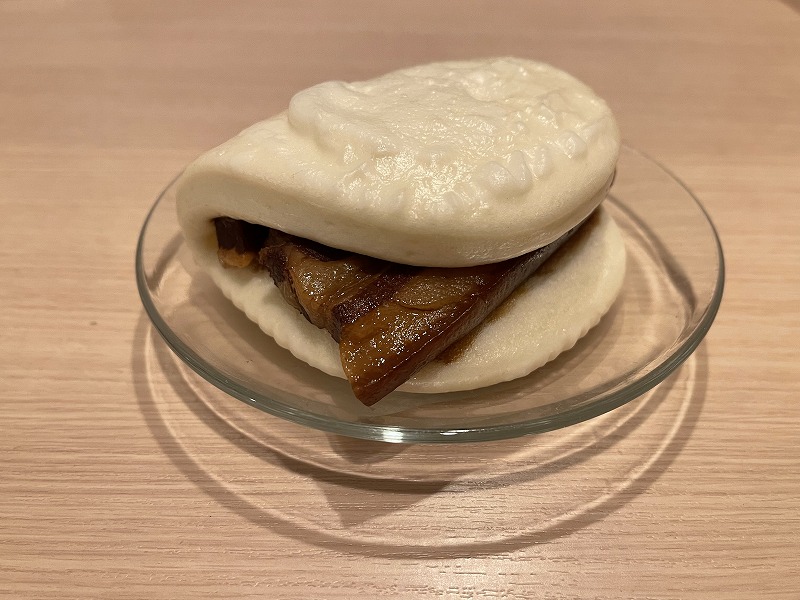 「中華菜館 春夏秋冬」でテイクアウトした「角煮まんじゅう」。まんじゅうの皮の中で柔らかい豚肉がトロっととろける。(2023.3)
