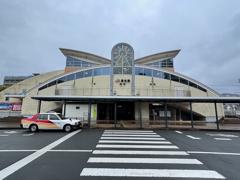 町の中心駅、長崎本線(長与支線)「長与駅」。名産品のみかんを半分に割った形をモチーフにした駅舎。長崎駅まで5駅、約17分で結ぶ。(2023.3)