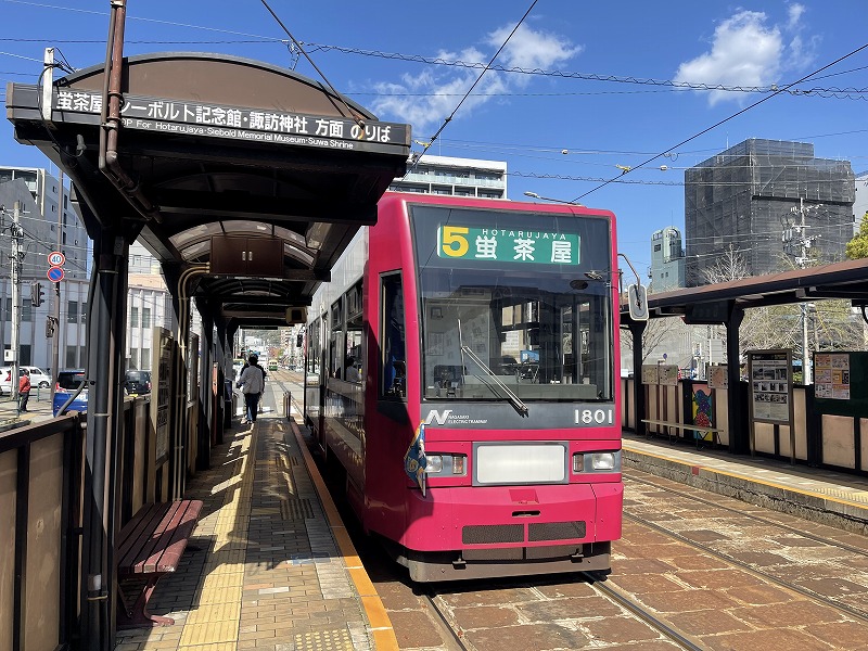 市街地を運行する路面電車「長崎電気軌道」。大人140円の均一運賃。(2023.3)