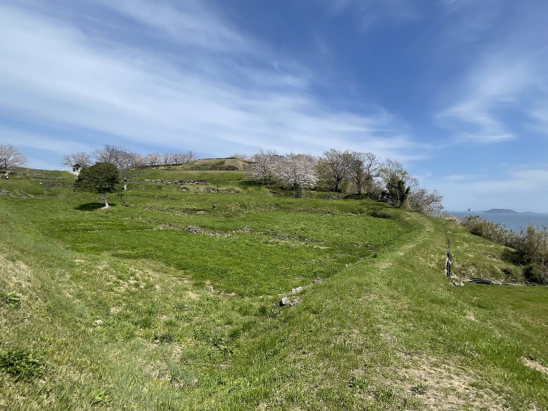 有明海に面した丘上に築城された「原城址」。1637年に起きた江戸時代最大の一揆、島原の乱で天草四郎が率いる一揆軍が廃城となった原城址に籠城したことで知られる。(2023.3)