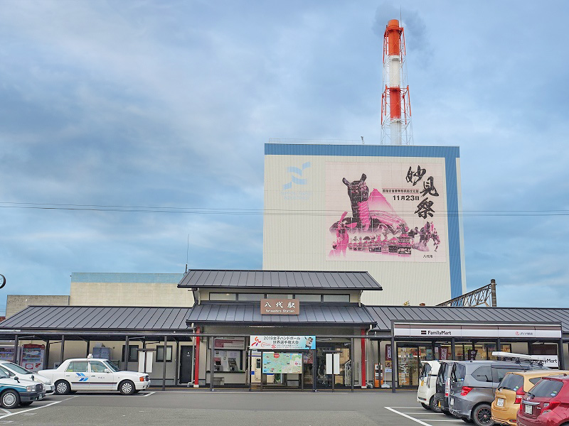 JR鹿児島本線、肥薩線、薩摩オレンジ鉄道線の3路線が乗り入れる「八代駅」。駅に隣接する「日本製紙八代工場」の「八代妙見祭」の壁画が目を引く。(2019.8)