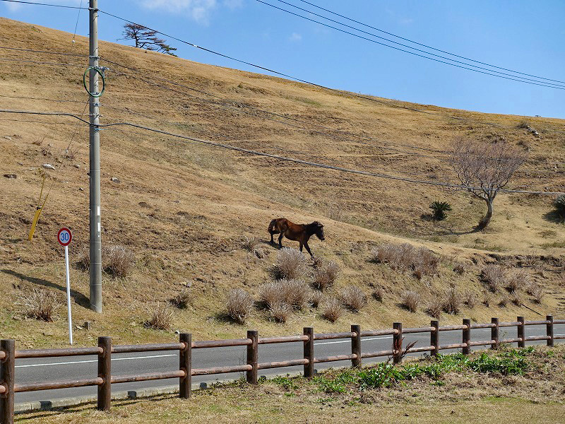都井岬に生息する日本在来馬「御崎(みさき)馬」。(2021.3)