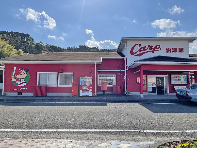 広島カープのキャンプ地であることから2018年にカープ仕様に塗り替えられた日南線「油津(あぶらつ)駅」。(2021.3)