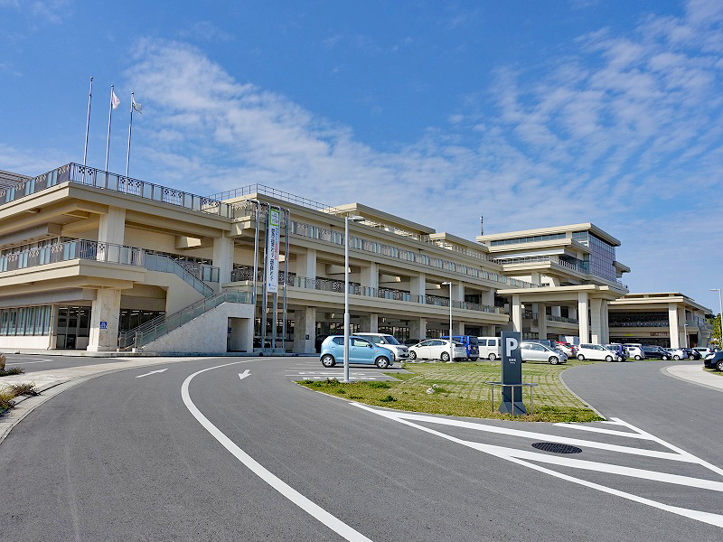 町内の有人島を結ぶ航路の拠点となる石垣港(石垣市)前に立地する「竹富町役場」。(2023.2)