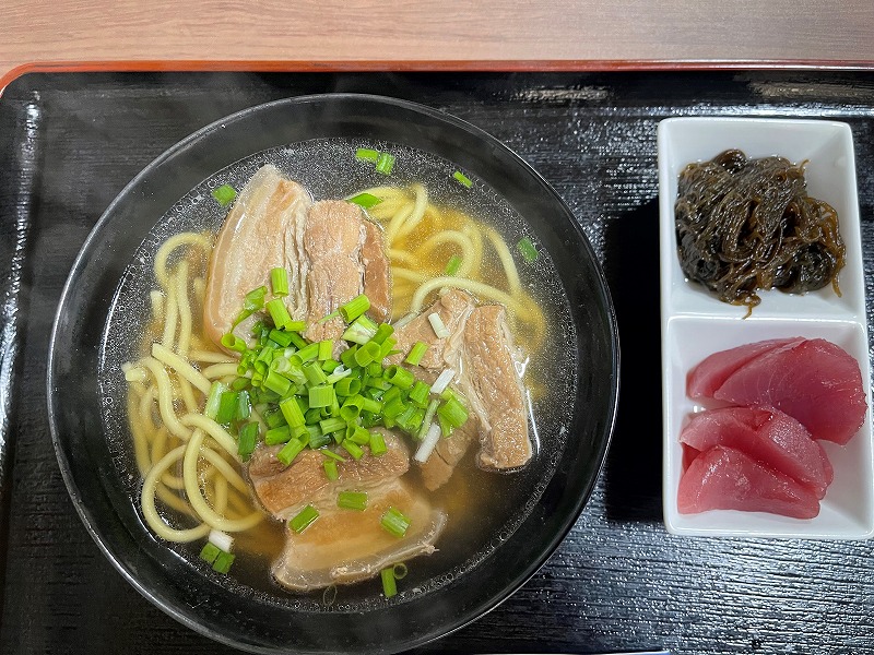 「楓食堂」の「八重山そば」。丸麺で甘みのあるスープ。島とうがらしを入れると味変。(2023.2)