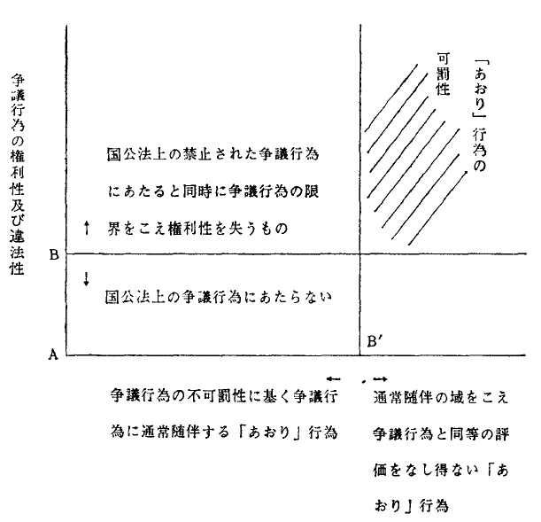 (二) 農林省職員の職務および責任の多様性と争議全面禁止の不合理性 [41]1 右を一瞥して気がつくことは、農林省職員の担当する職務の多様性である。その中には、本省内部部局の職員のように本来の行政事務の遂行に不可欠の補助事務に従事する、いわゆる非現業の職員もいれば、各種附属機関に従事する現業職員もおり、このほか現行法制下で現業とされている林野庁に、ほぼこれと等しい現業性をもつ食糧庁、水産庁の各職員をあわせると、農林省全職員(96,493名、昭和46年10月現在、以下同じ)のうち非現業とみられる職員(19,944名)が20.7%、現業もしくは現業的な職員(76,549名)は実にその79.3%に達する。(因に、林野庁の所掌する職務(農林省設置法第3章第2節)と食糧庁(同章第1節)および水産庁(同章第3節)のそれを対比しても、それぞれの職務の現業性――すなわち職務の性質上民間においても行うことのできる事業という性格――には格別の差異はみられないのである。) [42]2 また、その職務上の責任の多様性についてみると、前掲図表によつて明らかなように、農林行政の方針決定等に直接関与する高級職員(本省課長以上)は全職員96,493名中わずかに172名(全体比0.002%弱)にすぎず、その余の中、下級職員が実に全職員の99%以上を占めるという状況である。 [43]3 しかるに、国公法98条旧5項は、これら職務や責任の多様な、したがつてその職務の停廃の国民生活への影響も多様である農林省職員を、かれが「非現業」の公務員であるというだけで、全面かつ一律にその争議権を剥奪するものであり、あまつさえ同法110条1項17号はその違反に刑罰を科するというのであるから、その不合理性、ひいて違憲性はもはや疑いの余地なく明白といわねばならない。 二、農林省職員の職務の公共性とその争議行為が「国民生活全体の利益を害するおそれ」の有無、程度 [44] まず、前記の現業的グループについていえば、農業技術研究所や畜産試験場、農業者大学校はもとより、農薬検査所や生糸検査所、動物検疫所の場合でも、それぞれ国民生活ないし国民の健康や安全に関連があるとはいえ、これに明白で差し迫つた危険を生ずるためには、相当長期の職務の停廃がなければならず、それも保安要員等を配置しさえすれば、いかに長期にわたる争議行為の場合であつてもかかる具体的危険はほとんど防止しうると考えられる。食糧庁や水産庁の職員の争議についても同様である。 [45] つきに本省に勤務する非現業グループについてみれば、前掲の任務・権限の内容を一見して明らかなように、その担当する職務はいわゆる公共の秩序や安全に関わるものでなくして、国の資産の保全、開発や国民への生活福祉の供与を内容とするものであり、しかも職務の性質からすれば、同じ農林行政のうちでもさきの現業的グループに比べて国民生活全体の利益への関わりはより全面的ではあるが、間接的ということができる。したがつてその職務の停廃が国民生活全体の利益ないし国民の健康と安全等に及ぼす影響もまた、全般的ではあつても間接的ないし迂遠にあらわれ、国民生活に重大な支障をもたらすおそれが具体的、明白となるには、相当広範囲かつ長期の争議行為であることを要しよう。 [46] このようにみてくると農林省職員の争議行為が合憲的に制限されるためには、それが相当長期かつ大規模な場合に限られるから、むしろ「禁止」という措置よりは「調整」が適当であり、かりに禁止措置がとられるとすれば、高級職員に対象を限定すべきものと思われる。 三、(とくに警職法事件に関して) [47] 以上に述べきつたところをふまえて考えると、本件原判決は、第一に、冒頭に引用したごとく、本件罰条たる国公法98条旧5項を文字通りに解してこれを非現業国家公務員の争議行為をすべて禁止する趣旨のものとしている点において、仙台安保事件大法廷判決に明瞭に違反し、ひいて憲法28条の解釈を誤るものであり、第二に、本件半日ストをその規模が全国的であるというだけで、具体的にこの半日ストが国民生活全体の利益を害する明白なおそれを生じたか否かについて何ら顧慮することなく、国公法98条旧5項に違反するとし、あまつさえ可罰的違法性ありと断定している点において、中郵判決の基本見解の理解を誤り、さらには仙台事件判決の示す右条項の(合憲的)限定解釈にも反するものであり、第三に争議行為の正当性の法理と争議制限の法理とを混同し、結局において右98条旧5項や110条1項17号の解釈を誤つたものであることが明らかである。少なくとも右判決は農林省本省職員の半日ストによつて、「国民生活全体の利益」を害するおそれが生じたか否かを具体的に審理判断していないことは確かである。 四、(とくに長崎事件に関して) [48] また同様の見地から長崎事件の原判決をみると、同判決がまず国公法110条1項17号の解釈について、 「国家公務員といつても、その職務内容は多種多様であつて、国民生活に対する密着の度合、影響力には差