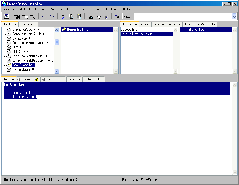 自動生成したメソッドは、引数がある場合その名前の意味がアバウトになっています。わかりやすくするために、引数名を変更しておきましょう。プロトコルペインでInstancesタブを選び、「accessing」→「birthday:」を選択します。