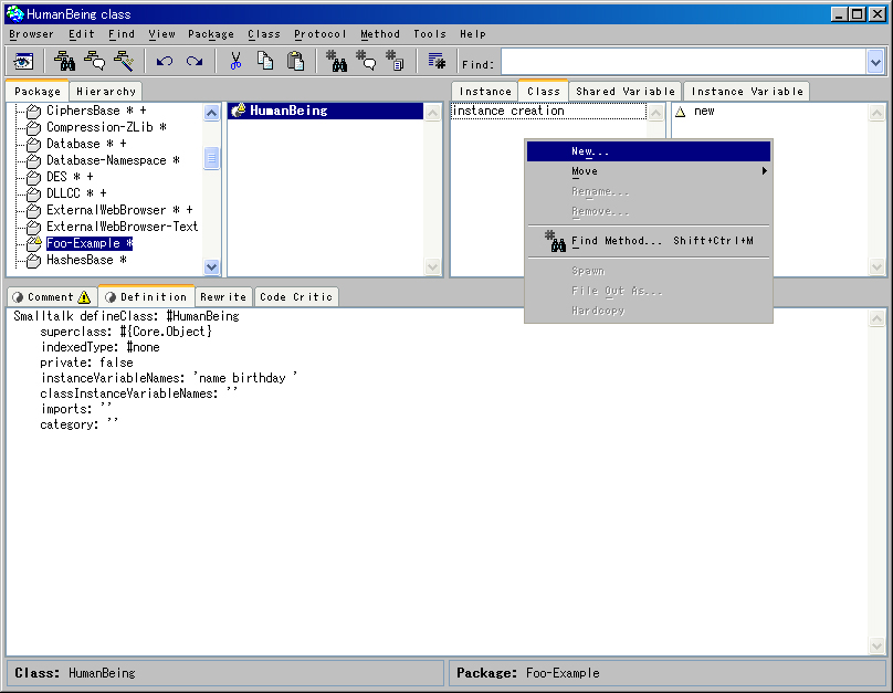 次に、新しいクラス「HumanBeing」を作成します。パッケージペインで「Foo-Example」を選択し、クラスペインで右ボタンメニューを出して「New Class...」を選択すると、新クラスの情報を入力するダイアログが出ます。