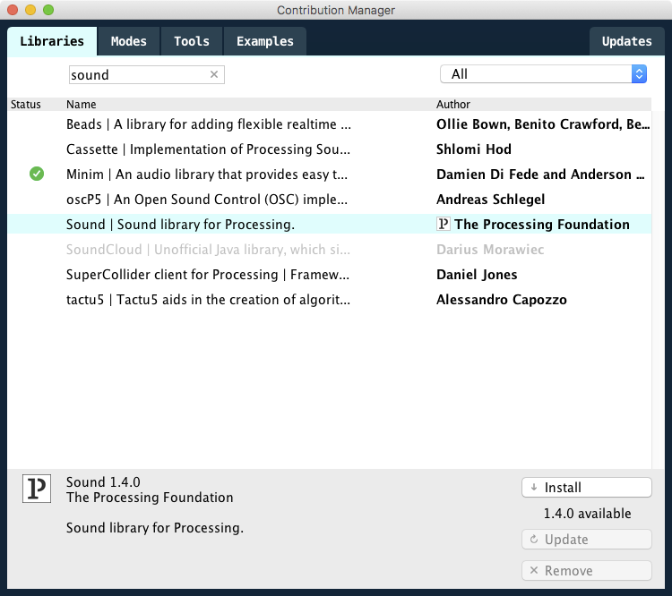 ライブラリを追加するには、まずProcessingのメニューの「スケッチ/ライブラリをインポート…/ライブラリを追加…」を選択する。ライブラリを管理するウィンドウが開くので、Librariesの中からSoundを探して選択し(検索を使うとよい)、右下のInstallボタンをクリックする(インターネットに接続されている必要がある)。