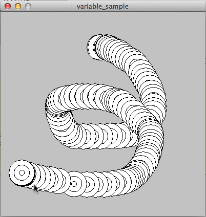 ここまでのプログラムは図形の座標をそのままプログラム中で指定している。これでは予め決まっていることをコンピュータにやらせるだけで面白くないので、ちょっと違うプログラムを作ってみよう。