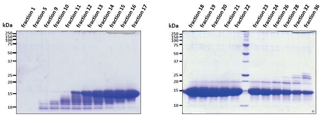 | 実験例 2) ・~15 kDa. ・Preparative disk gel 電気泳動を用いて、~15kDaタンパク質から大腸菌由来タンパク質を除去できた。 |