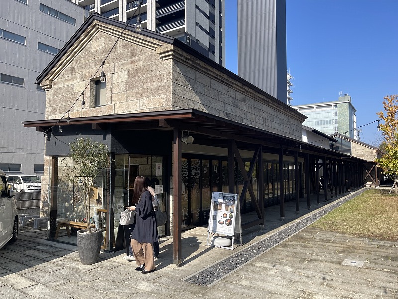 街中に立地する旧木村邸の石藏・土蔵をリノベーションした飲食・物販施設「gu/ra(ぐら)」。(2023.11)