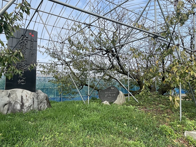 さくらんぼ畑に建てられた「佐藤錦発祥之地記念碑」。(2023.11)