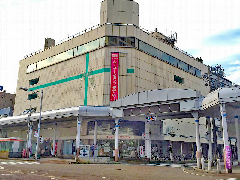 更にその先には、金沢資本の百貨店大和の旧長岡店。2010年に撤退し、建物は市に無償譲渡され、現在は1階を物産展「カーネーションプラザ」として活用。(2015.6)