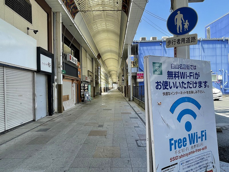 「エスプラッツ」裏の「白山名店街」。無料Wi-Fiが使用可能。(2022.5)