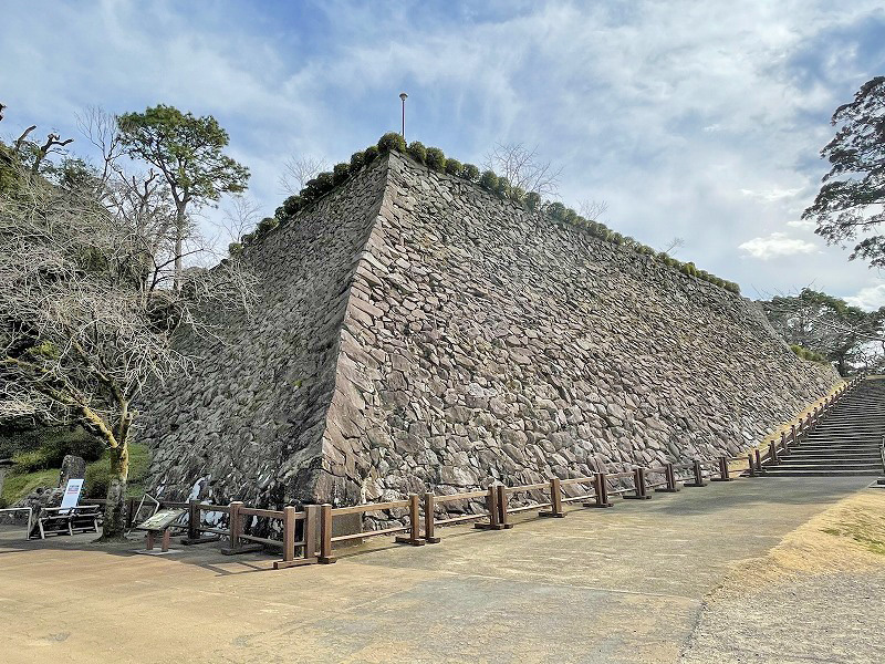 高さ22mの「千人殺しの石垣」。礎石を外すと石垣が崩れ落ちて千人の敵を倒すことができるとのいわれから命名。(2021.3)