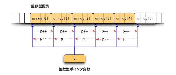 配列のある要素を指しているポインタ変数 p に対して,インクリメント操作 p++ を行うと, p が指す要素の添字が 1 増え,デクリメント操作 p-- を行うと,添字が 1 減る。