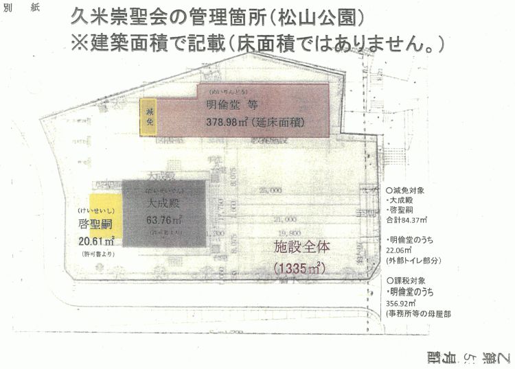1 施設の名称久米至聖廟 2 構成建築物等とその床面積(いずれも未登記) (1) 大成殿(床面積63.76平方メートル) (2) 啓聖祠(床面積20.61平方メートル) (3) 明倫堂・図書館(床面積372.59平方メートル) (4) 至聖門及び御庭空間等 3 建築物の構造と建築面積 RC造り一部二階建て(建築面積456.96平方メートル) 以 上