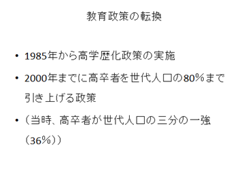 それが1985年からは、とくに日本の高校進学率の高さに刺激を受け、多くの生徒を高校まで進学させる方針に転換します。当時、高卒者が世代人口の三分の一強(36%)であったのを、15年間で、80%まで引き上げようという政策です。それ以前は、中学校ごとに、進学コースに残る生徒の割合の違いはもちろんあったのですが、中学校後期の進学コース(日本の中学2年と3学年に相当する学年)を比べると、学校間で教育レベルは、ほとんど差がありませんでした。